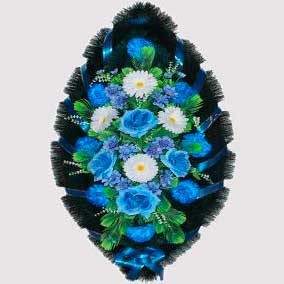 Ритуальный венок сине-белый из роз, гвоздик и зелени